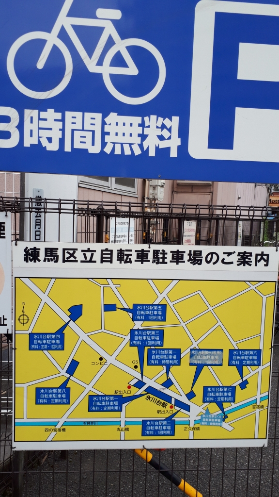 電柱の先に見える自転車置場の奥の左側に行ったところが氷川台駅のエレベーター乗り場にになります。バス停のある所で車を止めるのがベストです。鉄柵が空いている所がエレベーターから一番近い場所になります。