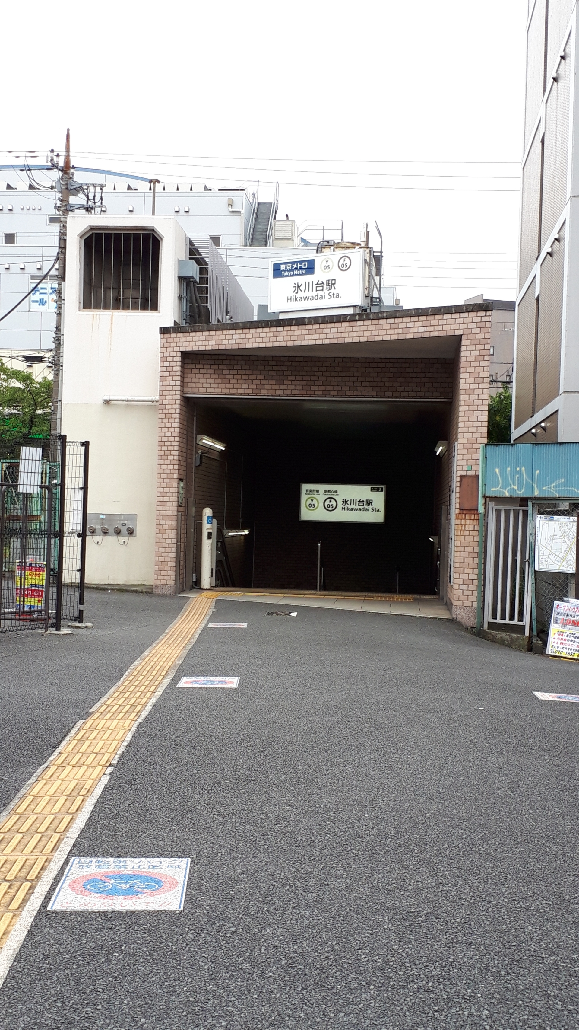 電柱の先に見える自転車置場の奥の左側に行ったところが氷川台駅のエレベーター乗り場にになります。バス停のある所で車を止めるのがベストです。鉄柵が空いている所がエレベーターから一番近い場所になります。