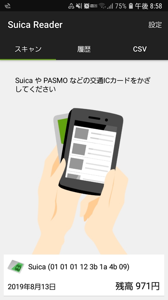 SuicaReaderを立ち上げると上の画面になります。画像に書いてあるように、スマホの下にパスモを置いてください。