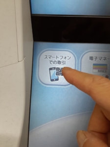 3.この写真の下の画面の「カードを入れたら取引がはじまります」の上の段の一番左端の枠で囲まれている「スマートフォンでの取引」指で押します。